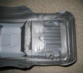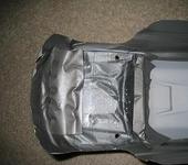 Кузов козлика не очень любит приземления на него и страдает, особенно в местах задних креплений. Чтобы усилить его, проклеил с обратной стороны армированным скочем. Вырезал из 5-ти литровой банки проставки и приклеил тем же скочем с обратной стороны.