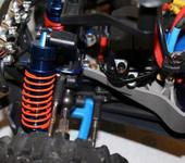 Металлические амортизаторы перед и зад (Front Big Bore Blue Aluminum Shock и Rear Big Bore Blue Aluminum Shock) - так как сток иногда ломается. Решил усилить. Что мне понравилось - шток толще, чем у стока, камера больше, в комплекте идут пружины разной жескости. Из минусов - передний амортизатор короче стокового примерно на 1 см, задний на 0,5 см. В итоге штоки короче и рабочий ход меньше. Амортизаторы имеют трехдырочный пистон, поэтому очень мягкие. Передние амортизаторы пружиной цепляют за тягу. Не критично, но факт есть. Амортизаторы имеют трехдырочные пистоны, из-за чего надо лить более густое масло. Мне показались не очень надежные, погнул шток после 15 минут катания 😃 За счет того, что корпус аллюминевый, то на штоке организовалась риска, которая будет рвать уплотнитель. Выход только один - менять шток. Запчасти нашел только в 2-х магазинах, притом доставка стоит дороже чем сами штоки. Считаю большим минусом отсутствие ремкомплектов по вменяемой цене.