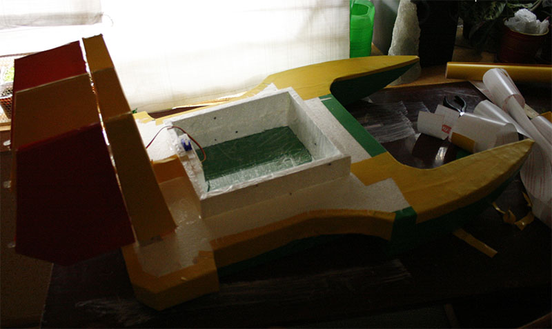 Теперь конструкция. Мотивы для вдохновения я подсмотрел у гидрошняги. Внешние формы имеют много общего. Но на этом сходства и заканчиваются. Так как аппарат изначально проектировался под мобильную лабораторию, то потолочка была заменена на чугун пенопласт плотностью 25 кг на куб. да еще и обтянутый винилом. А в особо ответственных местах поверх винила установлена металлическая броня. Ага 500 мкМ чистого алюминия. В общем полный броненосец. Летать ему судьбой не предназначалось, а значит с массой можно было особо не экономить. Ну а что касаемо осадки на воде, так все решаемо размером. Кроме того размер и для устойчивости полезен. В общем берем лист пенопласта 40мм толщиной и режем палубу.