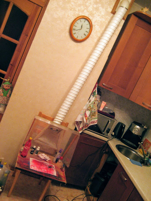 Крашу на кухне, хоть краски и не пахнут, но “оверспрей” московской экологией не растворяется, остается в легких и на стенах квартиры. Поэтому построил раскладную вытяжку.