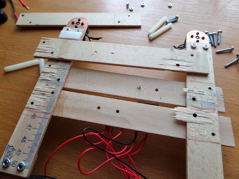 Вопрос к автору, а зачем моторамы из текстолита? Не проще было прямо в линейках соответствующие дырдочки просверлить, а под головки винтиков шайбочки побольше и все?
