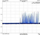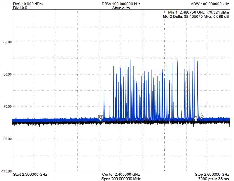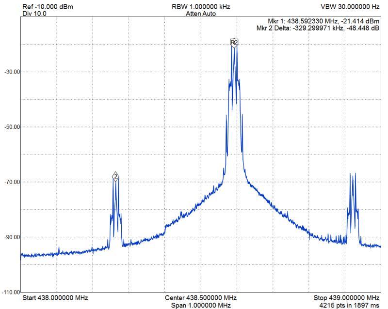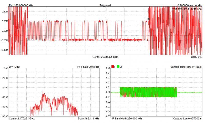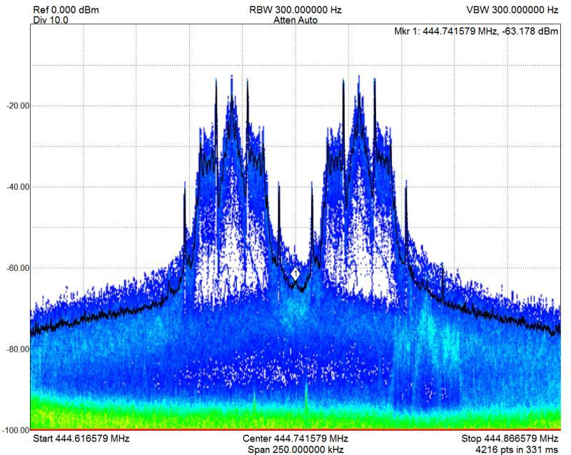 Спектральная чистота не ахти, виден главный трехгорбый канал передачи, довольно широкий фазовый шум и две паразитных копии канала, на 50dB слабее и на 330кГц правее и левее основной частоты. При шаге сетки частот 60кГц, помеха получается на 330/60 = 5.5 каналов левее и правее. По идее считаться приемником как реальный пакет не должна.