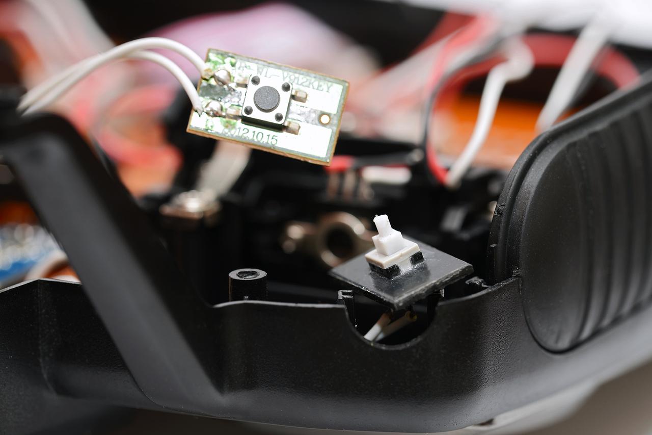 Две верхних кнопки на торце пульта выполнены на обычных микро кнопках. И если левая кнопка которая отвечает за различные функции мыльных пузырей и фото съемки, как раз подходит для выполнения возложенных на нее функций, то вот правая кнопка которая отвечает за повышенные расходы, должна зажиматься и удерживаться пальцем, для того чтобы эти самые повышенные расходы работали.