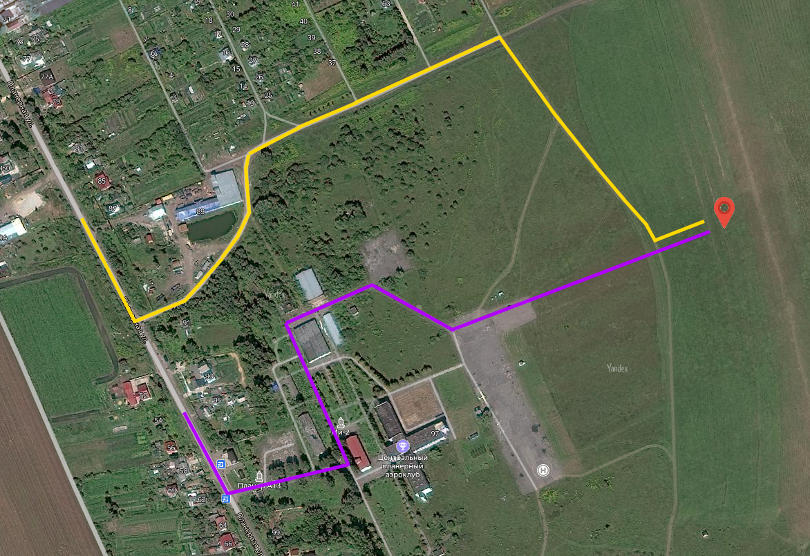 Фиолетовая линия - это если ехать через ворота аэроклуба, желтая, если ворота закрыты, то в объезд, но там дорога похуже.