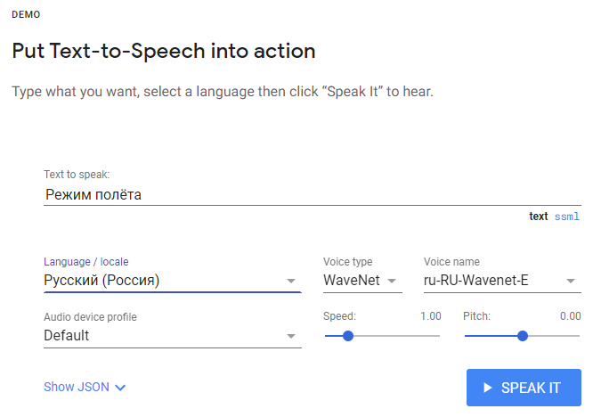 Я же, сделал абсолютно то же самое (и вам советую, если вы не хотите всего того гемора, который описан в этой статье) несколько месяцев назад, нагенерил себе нужных фраз (режимы полётов разные, в основном) и был вполне себе доволен. Но, недавно мне понадобилось сгенерировать дополнительно ещё пару фраз и каково же было моё удивление, когда голос там оказался другим. Причем не только голос другого человека, но и сами слова получаются более растянутые и фразы занимают больше времени, что мне совсем не понравилось. Google по-тихому сменил русский голос по умолчанию, чем и вызвал всё то, что мне пришлось проделать в этой статье.