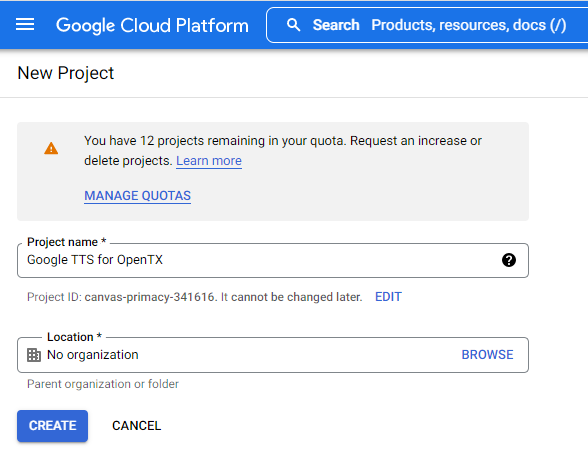 Там чуть ниже правого верхнего угла будет кнопка “CREATE PROJECT”. Нажимаем её и создаем проект, собственно. Даем имя проекту, допустим “Google TTS for OpenTX”: