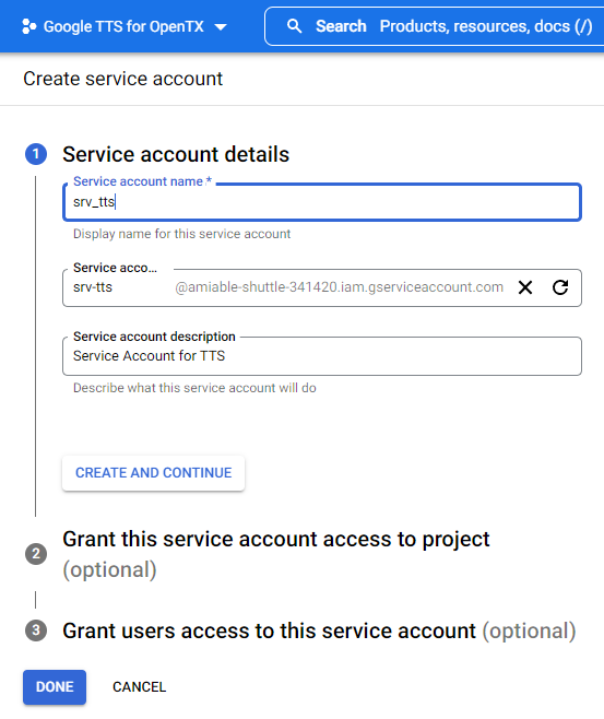 - Service account description - описание, у меня это “Service Account for TTS”.
