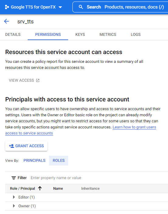 После того, как учетная запись создастся, заходим в её свойства, вкладка DETAILS, там копируем в буфер обмена Email (у меня это srv-tts@…iam.gserviceaccount.com), переходим на вкладку PERMISSIONS и нажимаем кнопку GRANT ACCESS:
