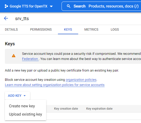 В появившемся окне оставляем предложенный тип по умолчанию JSON и затем CREATE. Нам предлагается сохранить ключ к себе на компьютер, что мы и делаем. Есть смысл сразу создать отдельную папку под это всё, например D:\GoogleTTS, как у меня. Ну и сам файл тоже есть смысл переименовать во что-то более короткое и понятное, например srv-tts.json.