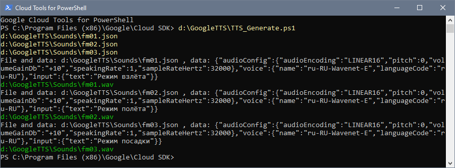 В дальнейшем, если нужно будет сгенерировать новые фразы, просто пишете их в скрипте TTS_Generate.ps1 и заново запускаете его из консоли Cloud Tools for PowerShell.