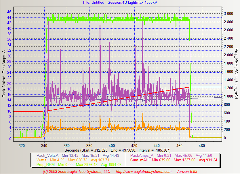 Видно, что в пиках мощность превышает отметку в 600 Вт. Если поднять обороты до 3000, то можно снять и больше мощности. Вертолет с батареей 4S и с комплектом телеметрии весит 930 грамм, но при это очень неслабо подрывает. Крутить флипы очень комфортно. С батерей 3S и без телеметрии должен быть еще резвее.