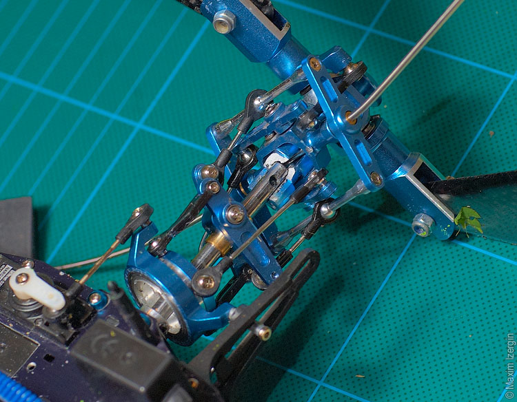 Вчера вечером решил отработать кувырки назад и вперед с новыми настройками мотора. Полеты сразу не задались, первый пак я случайно отлетал с половинными расходами в передатчике. Два раза чудом вытащил слабоуправляемый вертолет из крутого пике. Потом сообразил в чем дело, поменял пак и стал летать дальше. Во время очередного кувырка назад дал слишком много отрицательных шагов, вертолет вначале подбросило вверх, а потом кинуло на меня. А я выруливать в ситуации, когда вертолет прямо над головой, пока не умею. Всё, что я смог - это дернуть вовремя холд. Вертолет влетел в землю по касательной, почти параллельно поверхности, но с высокой горизонтальной скоростью.