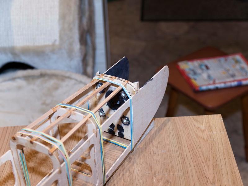 Продолжение постройки: вклеил каркас в хвостовую балку - как видно на фото, там так раньше и было. Именно в этом месте был стык хвоста и носа. Я специально разобрал фюзеляж до этого места, как только увидел соединение. И вычерчивал по живым боковинам от соединения до передней кромки крыла.