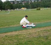 Первым делом по приезду я написал на rcgroups в FPV форуме просьбу откликнуться всем кто в Осло, и поискал всех моделистов из Осло, практикующих FPV (нашел пару) и разослал им письма. Никто не ответил. Тогда пошел на одно поле в Ekeberg, найденное в Google Maps, полетал на складном Торике, который привез с собой. Потом Поехал на другое место на полустров Bugdoy и полетал по камере на поле рядом с королевским ранчо. В промежутке между событиями встретил иранца по имени Камран, который посоветовал встретиться в выходные в Ekeberg’е, там будет обычная тусовка моделистов. И верно, в воскресенье вечером на указанном месте было человек 12 моделистов и 15 самолетов. У них даже была стационарная взлетка из зеленой пластиковой ковровой дорожки!