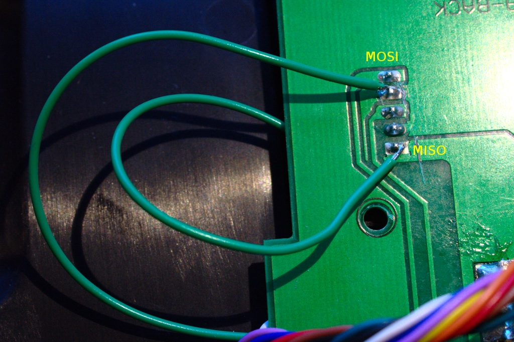 Не забудьте перерезать дорожки с двух сторон платы. Сопротивления, которые в стоке на плате к ногам проца (те что моси и мисо) шли отпаяли? Вот к этим освободившимся ногам (моси и мисо) через сопротивления 220 Ом (можно сопротивления кстати не паять, а паять к стоковым сопротивлениям на 200 Ом, а за ними резануть дорожки) и кидайте проводки от контактов (от тех, вокруг которых дорожки с двух сторон порезали). И все