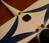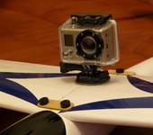 Над креплением камеры долго не думал. Просто приклеил с помощью эпоксидного клея к крылу входящую в комплект крепёжную площадку от GoPRO. Надёжность высокая, площадка опирается на несущую нервюру из фанеры. За камеру можно взять и потрясти планер, нигде ничего не трещит и не хрустит.
