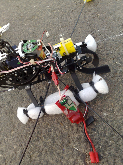 Вообщем все было собрано и летало отлично во дворе дома, уже разобрался что куда, поднимал его на уровень груди, т.е. начал уже тренировки с управлением. Но вечером на площадке верт накрылся п…й. После моих пробных полетиков, решил дать брату поуправлять, что-бы он понял что это не так просто. Так и вышло. Верт резко взлетел метров на 15 и там оказалось что опустить его надо тоже уметь. Я ни в чем его не виню, т.к. это действительно надо прочувствовать — что управление его инерционное, что он не сразу реагирует на движения пульта, а когда начинаешь еще и резко дергать стиками можно только усугубить ситуацию. Я лишь только сейчас стал понимать что вначале его нужно поднять невысоко, скорректировать, а потом осторожно стиками туда куда хочешь, по программистки это как написать лишь 50 строчек кода, а потом чутка диффами по 5-6 строчек патчить. Вернусь обратно к теме, получилось на высоте 15 метров его нужно опустить, а когда при опускании оборотов верт стал падать камнем, брат подымал обороты, тогда он опять взлетал и так продолжалось 5 секунд пока он не упал на траву и из него стал валить светлый дымок. Мои опасения о загоревшейся батарее не оправдались, мог быть пожар и тогда остался бы только пепел от верта, а так полетела лишь электроника и один мотор.