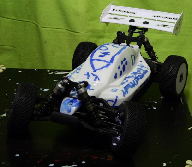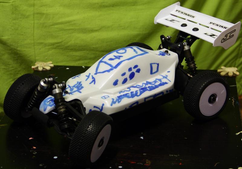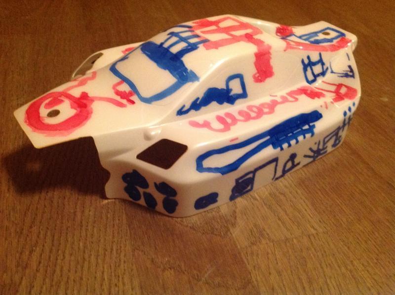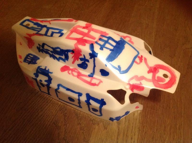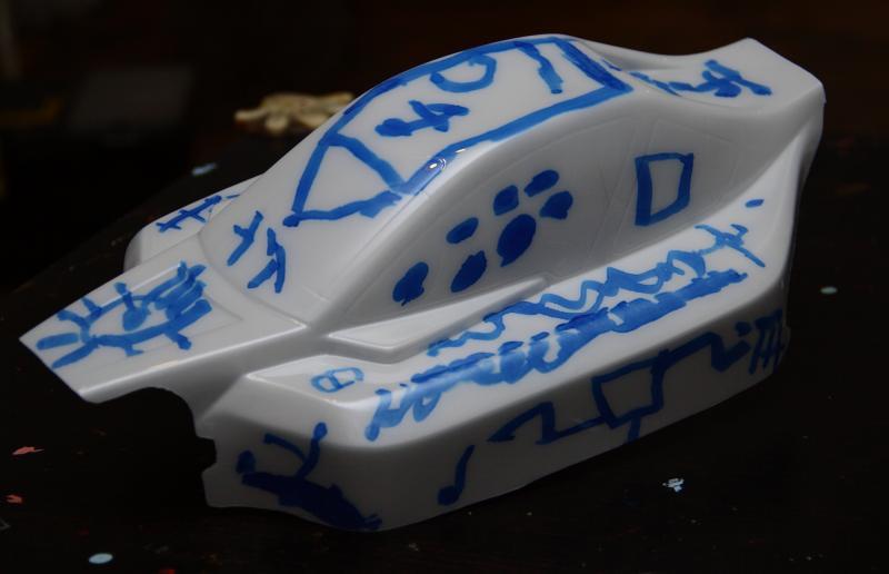 И так. Купил я новый кузов на мюгена (а как иначе 😃). Стал думать как его красить. Так как у меня был балон белой краски в наличии основной цвет был предопределен. Дальше труднее - как сделать что-то, что бы было не как у всех, но и не довести себя “до аэрографа за деньги на заказ”. Линии а-ля стрит рейсер “всех порву” мне не хотелось, громы молнии, дымки и прочее тоже. Решение пришло быстро. Есть у меня в доме 4-х летний художник (не все же ему стены разрисовывать 😃), который уже года два к тому же ходит рисовать. На мою просьбу - разрисовать кузов Севка откликнулся с охотой. Дело за малым - чем… Решил купить “злой” маркер. Черного не нашел. нашел синий. Итак нужно:
