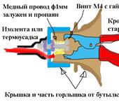 У нас на работе заменяли акки в бесперебойниках их там по 4 штуки, по сроку вышли а по емкости еще ничего. И решил я запараллелить все 4 акка. Сложил их набок в ящик типа инструментального со всех сторон обложив пенопластом, чтоб не теряли емкость на морозе ведь МЫ С УРАЛА и летаем до -25, а на электричках и до -30 летал (тока чето машинки вялые). Вывел провода для зарядки от прикуривателя машины, провода для стартера и провода для зарядных устройств - теперь заряжать борт, передатчик и электричку можно прямо в поле. Провода на прикуриватель включил через диод во избежание замыкания, по той же причине на концах проводов для стартера сделал такие вот изоляторы: