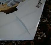 “Белая лента идет в комплекте. А вот как ее клеить непонятно, если добавить “лишнюю” деталь то снизу торчит киль (как на снимке).” – может быть, достаточно хорошо приклеить полоски ленты спереди и сзади киля поперёк модели (вдоль крыльев?)