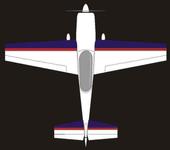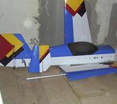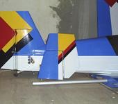 Выглядит аппарат примерно как на картинке. Окраска несколько иная, фюзеляж- синий верх белый низ. Плоскости снизу бело-синие полосатые, сверху белые с широкой синей полосой вдоль передней кромки, по краям черные, желтые, красные пересекающиеся квадраты и полосы. В общем, очертания можно сказать Экстра 300 . Руль направления несколько ниже чем должно быть у Экстры 300 и шире. Но отличительной особенностью этой Экстры является то, что в фюзеляже имеются два отверстия для трубы на которой собственно и держатся крылья. Именно таким способом можно передвигать крыло ближе или дальше относительно первого шпангоута, меняя тем самым центровку. В хвостовой части имеются четыре отверстия для крепления стабилизатора. Таким образом можно перемещать стабилизатор сантиметра не полтора выше ниже относительно оси фюзеляжа, а также вперед и назад. Раннее с возможностью таких настроек самолета не встречал. Хорда крыла и стабилизатора лежит на одной прямой и практически на осевой двигателя.