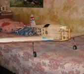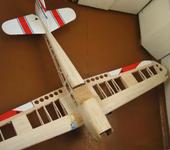 Собранные фанерки от продуктовых ящиков были высушены, парочку забраковал, остальные более-менее пригодны. Склеил несколько фанерок на ус между собою, из них сделал боковины фюзеляжа. Вырезал в них облегчения, шпангоуты также сделал из остатков фанеры. Склеил все - получилось пол фюзеляжа - как раз до середины крыла. Распилил фюзеляж пополам, используя накладки на боковинах фюзеляжа (осталось от прошлого ремонта) склеил две половинки фюзеляжа. Кстати, морду я собирал с уже установленным баком. Потом обклеил все бальзой, вплоть до середины крыла. Покрыл пленкой пользуяюсь утюгом, поставил мотор. Петли для элеронов сделал из скрепок и жести от банки. В них осталось насверлить отверстия в жести - для облегчения и повышения надежности вклеивания, а на рамку из проволоки намотать нитки - также повышения надежности вклеивания. И вклеить на эпоксидной смоле в крыло и элероны. На изготовление петель ушел где-то час. Затем останется установить радиоуправление и можно в небо 😉