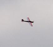Выбрался сегодня на полетушки. Долго пытался завести двигатель - что то капризничал он сегодня. Завел, вывел на нормальный режим. Немного покатался по взлетке. Заглушил. Покурил, успокоился. Ну чтож, взлетаем! Поднялся в воздух, полетал. Оттримировал модель, попробовал пару петель и пару бочек, пообвыкся с управлением. Отлетал около 5 минут. Самолет носится по небу как ракета! Сработал таймер и я начал заводить самолет на посадку. Как на зло на дороге появилась машина. Пришлось уходить на поле. С холостого хода мотор уже не вышел на обороты и заглох. Мягко спланировал в траву и плюхнул модель. Повреждения легкие - немного выгнулось шасси.
