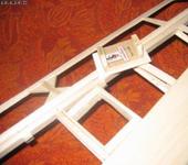 И тут вопрос. Из чего делать шпангоуты? Бальза? Нет , слишком дорого. И я как закалённый авиамоделист пошёл бродить по помойкам рынкам, и другим злачным точкам в поисках ящиков от испанских апельсинов. Материала нашлось в изобилии. 3х миллиметровая фанера как нельзя лучше подходит для шпангоутов. Она лёгкая и прочная, а также легко обрабатывается. Из неё я сделал кольца-шпангоуты шириной примерно сантиметр. К моему удивлению прочность необыкновенная. Рейки сделал из осины(10 штук 4на 2,5 мм). И стал с резиночками собирать фюзеляж. Форма получилась отвратительная, но не тут то было пара минут работы натфилем шкуркой, нулевой шкуркой и мои шпангоутики сияли белезной. Форма стала отменной. Все стало ровно и правильно. Но и эту работу я отложил и занялся снова крылом(бальза к тому времени уже появилась).
