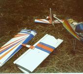 Первым полетел тренер - оказался весьма резвым. Пилот - новичок, ходил очень широкими кругами, пожаловался, что влево и вправо крутит виражи по-разному. Постепенно самолет стал уходить все дальше. Не гоже каркать под руку, но тут уже не мог выдержать, и, как речевой информатор, все настойчивее просил держаться ближе. Напрасно: скорее самолет летел сам, чем пилот управлял им. Наконец, модель оказалась примерно в 400-500 м, пилот сказал “Все, уже не справляюсь”. Зарулился. Я попытался перехватить передатчик, но на несколько секунд потерял модель на фоне серого неба. А аппарат уже сыпался вниз градусов под 70. Попробовал взять ручку на себя, но, видимо был крен (а куда, поди разбери). Морковка!