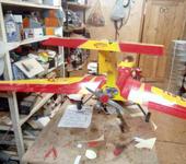 полетов 6-7 сделал, для меня явно перебор,для кота видать тоже, вообшем , на развороте подглох мотор, никак не добью регулировку системы помпа-обратка -карб.,чую истина гдето рядом ,но все никак никак, в все что успел сделать дернул тумблер расходов на максимум и плюхнул плошмя на поле, из повреждений погнул шасси , лопнул фонарь,был уже треснут,ну я его доломал,и оторвался шпангоут под фонарем, я к нему батарейку временно примотал , через 10 минут самолет уже взлетел сделал один полет ,правда без фонаря, но после приземления развалилось колесо , на стойке которую больше всего погнуо,