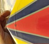 Руль высоты штука хлипкая, сверху прижимать только через широкую накладку и проверить положение относительно оси модели и расстояние от кончиков до оси самолета примерно около переднего колеса, у меня разница была 3 см - китайцы отверстия на глаз делают…