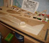 Далее вставляю вставки из фанеры, по толщине соответствующей толщине бальзы, на эпоксидке. На эти места потом будет крепиться двигатель и стойки шасси.