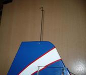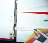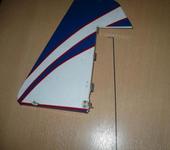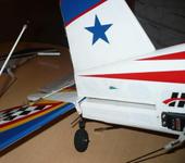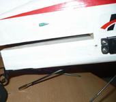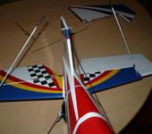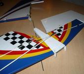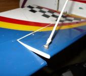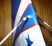 В киле и в руле направления были прорезаны вертикальные пазы. В них вставлены отрезки карбоновых трубочек ,обернутых кусочками майлара и вклееные на эпоксидке. Сверху, в роговом компенсаторе руля, просверлено отверстие под шомпол ,соединяюший трубки на киле и на руле.Также шомпол проходит насквозь хвостовик стабилизатора. В стабилизатор впереди прорезаны вертикальные пазы на глубину 20мм и в них вклеены текстолитовые флажочки с отверстиями под саморезы диаметром 1,5мм. Также в стабилизатор , по краям вклеены обрезанные шарнирные ,штырьковые петли диаметром 3 мм. На другой ,свободный конец петель(обточенный до 2 мм ) надета и приклеена циакрином ,карбоновая трубка (раскос) внешним диаметром 3 мм, оканчивающаяся вилочным металическим наконечником для тяг.Вверху киля вклеена поперечена ,к которой прикрепляются наконечники раскосов. Для того чтобы снять оперение надо: -отсоединить наконечники раскосов и тяг от кабанчиков, -открутить 2 самореза ,с ушек стабилизатора,-вытащить шомпол из рудера,-вынуть рудер,-вынуть стабилизатор. На одном из фото ,возле пенала для трубки видны зеленые разъемы для машинок в крыле .Вся сборка занимает не больше минуты.