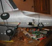 Вот наконец-то самолет собран, изготовлены и установлены шасси с рулевой носовой стойкой и сегодня произведен облет. Самолет в полете очень предсказуем даже несмотря на довольно сильный (для облета) ветер, слушается всех рулевых поверхностей. Единственное, что пришлось сделать, так это установить двойные расходы сразу после взлета, так как в соответствии с инструкцией расходы очень маленькие и на небольшой скорости самолет рулей практически не слушается. С батареей 2200 мА летал 5 мин, а с 3300 тоже больше не рискнул, хотя после зарядки аккумулятор взял всего 1670 мА, т.е. можно попробовать минут 8-9. Выкладываю фото сделанного шасси и видео сегодняшнего полета. Как всегда большое спасибо Вадиму (Stork1) за консультации, тримирование во время полета и помощь при посадке и его жене Светлане за профессиональную видеосъемку.