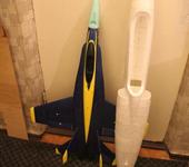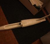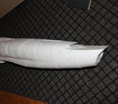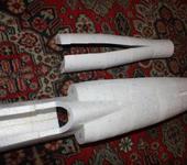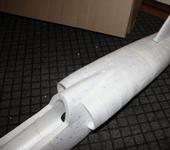 Думал делать отдельно носовой обтекатель или делать вместе а потом отрезать. То же и по капоту двигательной установки сзади. А вчера понял, что ничего отрезать не нужно - нужно делать весь корпус мастер-модели целиком, а потом делать матрицы по месту. Сегодня склеил весь корпус от обтекателя до сопла. Кстати - уже есть вес - 90 грамм. Так что - не такая эта пена и невесомая.