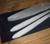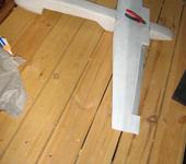 Крылья и центральная часть делаются из потолочки, в один слой с вставлением лонжеронов. По передней кромке крыльев пропускаю 15 мм. ширины полоски в два слоя и стачиваю их на “ус”. Элевоны вклеиваю заранее на двухсторонний скотч, в трех точках.