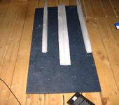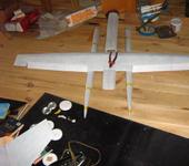 Крылья и центральная часть делаются из потолочки, в один слой с вставлением лонжеронов. По передней кромке крыльев пропускаю 15 мм. ширины полоски в два слоя и стачиваю их на “ус”. Элевоны вклеиваю заранее на двухсторонний скотч, в трех точках.