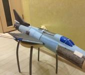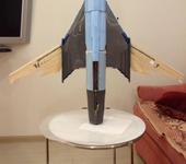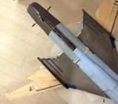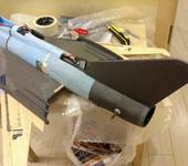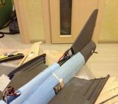 Итак,друзья… Окинув взглядом хвостовую часть фюзеляжа, еще раз отметил, что здесь у нас должен быть самый минимум веса. Для центровки однозначно-жирный плюс, а второе- хвостовая часть в районе сопла, один черт,пострадает меньше всего. Ну если только самолет ухнет вертикально вниз соплом вперед. В результате ряда весовых экспериментов победил EPP,как самый легкий материал для хвостовой области. На фото виден ход заделки сопловой части фюзеляжа. Сделал приспособу, с помощью которой распустил куски депрона и EPP на 2 мм пластинки. Их комбинацией и обклеил оную часть по EPPшным направляющим. Черно-серый цвет депрона очень кстати! Сопло оригинала примерно такого же цвета, так что красить не надо будет. Итог- плюс 10 граммов на этом этапе. Можно было еще пару граммов отыграть. Конструкция,нужно сказать,получилась дышащей. Под несильным сжатием пальцев она легко деформируется, возвращаясь в прежнюю форму. Но принимая во внимание тот факт, что хватать фюзеляж в этой его части(например для запуска)не придется, вполне себе нормально!