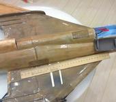 Все это дело обтянуто скотчем. Итоговой вес 1110 гр. О как. Отматывая назад,вспоминаю: что добавляло вес? Труба канала воздухозаборника,подвеска, машинки на управление стреловидностью крыла,кинематика и силовые элементы поворотных узлов… Короче “лишние” грамм 200 и более, как неотъемлемая часть проекта, тоже отправятся в небеса. Кстати о них. Взлет будет с катапульты. В носовую часть самолет вклеен крюк. По обе стороны киля вырезаны щели,что бы забираемый на охлаждение регулятора воздух стравливался. Киль,кстати,то же "пострадал"от попадания. Так… Осталось проверить настройки. Ну и беспокоит меня центровка, парни… В общем с меня-кино,мужики!