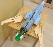 Итак,друзья… Окинув взглядом хвостовую часть фюзеляжа, еще раз отметил, что здесь у нас должен быть самый минимум веса. Для центровки однозначно-жирный плюс, а второе- хвостовая часть в районе сопла, один черт,пострадает меньше всего. Ну если только самолет ухнет вертикально вниз соплом вперед. В результате ряда весовых экспериментов победил EPP,как самый легкий материал для хвостовой области. На фото виден ход заделки сопловой части фюзеляжа. Сделал приспособу, с помощью которой распустил куски депрона и EPP на 2 мм пластинки. Их комбинацией и обклеил оную часть по EPPшным направляющим. Черно-серый цвет депрона очень кстати! Сопло оригинала примерно такого же цвета, так что красить не надо будет. Итог- плюс 10 граммов на этом этапе. Можно было еще пару граммов отыграть. Конструкция,нужно сказать,получилась дышащей. Под несильным сжатием пальцев она легко деформируется, возвращаясь в прежнюю форму. Но принимая во внимание тот факт, что хватать фюзеляж в этой его части(например для запуска)не придется, вполне себе нормально!
