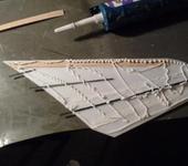 Идет помаленьку. Да как-то вроде нет интереса к темке, поэтому и молчу пока. На самом деле в выходные закончил монтаж сдвоенных перьев на одну ось. Механически получилось достаточно прочно и без люфтов. Посмотрим, как будет работать с тягой. Раскроил все части обшивки и выгнул. Также получилось вполне удовлетворительно. Резал с небольшим запасом по длине, чтобы дорабатывать по месту. В натяг под скотч. Установил обшивку на донной носовой и хвостовой части. Клеил UHU. Также установил бобышки на центроплан для правого крыла. Из не очень желаемых операций (но никуда не денешься) пришлось догрузить носок грузами до 32 г. Хорошо, если этим закончится. Сделаю вкладыш из пластика для возможной догрузки (пульки от воздушки) если понадобится. Но это уже после сборки.