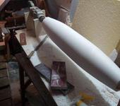 Обтянул цветным скотчем. Скотчем обтянул потому что пенопласт шариковый как не шкурь поверхность пористая остается и смолы много вбирает в себя. А цветным потому что когда пенопласт удалю изнутри и буду отдирать скотч-видно будет хорошо если где останется. Фонарь из серого пеноплекса. Закатал болван в три слоя ткани 48 плотности. Перед укладкой ткани сразу приклеил кольцо воздухозаборника. При укладке ткани делал заворот на это кольцо. Таким образом сразу сформировал воздухозаборник.Завтра посмотрю что получится? Не понимаю почему опять фотки не встают как хочется.