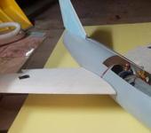 Установил “выхлопную” трубу. Хвост готов к установке.(на фото просто вставлен в прорезь.Боуден будет внутри дти) Все остальные шпангоуты нарезаны и вот вот будут установлены. Прикинул центровку. Пока вроде попадаю. Сильно смущает вес. Ожидаемый конечный результат 1300 гр. Из всего самолета 610 грамм-импеллер, регулятор, батарея, приёмник. С таким весом думаю будут проблемы со стартом. С катапультой что то не охота возиться)