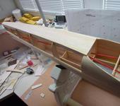 Хвостовое оперение. Немного закосячил с вертикальным стабилизатором, поэтому когда уже собрал увидел, что не установил бальзовую рейку в неподвижную часть стабилизатора, кот. должна была служить для придания закругленной формы между двумя частями стабилизатора. Поэтому выкрутился так: обточил бальзовый брусок 8*8 с одной стороны, придав ему закругление и вклеил в образовавшуюся щель, получилось конечно не совсем айс, но как говорится “без вариантов”