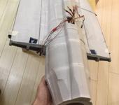 Все замуровано, кроме регулятора, что нуждается в охлаждении. Потом должным образом организую его рабочую зону. Ну а пока что можно приступить к обтяжке скотчем, ибо, наконец-то шлифовка пенопласта завершена! Без киля и концевых частей консолей крыла обтягивать скотчем будет легче. С килем, например, вообще не удобно: того и гляди поломаешь его, пока модель вертишь.
