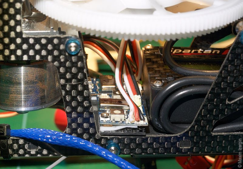 Для поддержки режима без флайбара необходимо подключить два кварцевых гироскопа, на хоббисити есть Nano Gyro. Плюс разнесенной системы в том, что гироскопы можно очень точно расположить в необходимом месте, в центре тяжести. А блок управления допустимо крепить где угодно.