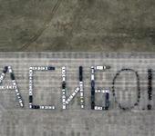 Немного о мероприятии: в положенное время на аэродром подтянулись не равнодушные к празднованию Дня Победы автолюбители. Организаторы акции любезно расставили автотранспорт, которого оказалось: автомобилей около восьмидесяти, мотоциклов порядка тридцати единиц, а самих автовладельцев попросили сделать собой “!”.