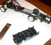 решил полностью переделать заднюю часть. редуктор от мини з был слишком нереальным. ни одной мостовой модели в данном масштабе в москве не нашел, посему взял тамиевский набор внедорожника с двумя дифами и центральным карданом. почти, как в реальности. изначально мотор должен был быть между колесами. укоротил, приклеил к шасси. получилось кажется неплохо. теперь очередь за редуктором. пока размышляю, но идеи есть. фото того, что было и что стало