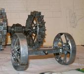 Потихоньку собираю передний мост. Передние колёса пока без реборд. Получились малость кривоваты, не знаю, буду ли их переделывать. Может быть вихляние такому трактору пойдёт только на пользу для зрелищности и исторической правды;)