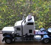 Всем привет.После выставки “Хобби” решил переделать Кинг Хаулера,тем более на зарубежном форуме нашёл оригинальный прототип и зачесались руки.Взял балгарку и отделил кабину от спальника.Из АБС пластика сделал надстройку спальника,выпелил и вставил окна из синего оргстекла,с кабиной тоже пришлось повозиться:были убраны фары(новые изготовлены из толстых маркеров),изменён угол наклона крыши кабины с заходом на спальник,надставил передние крылья ,задние изготовлены с нуля из пластиковой трубы,повторители поворотов сделаны заново и установлены под зеркала,также заново сделаны передний и задний бампера,решётка радиатора,переделана серва на седло.За кабиной добавлены две подножки.Все разъёмы и переключатели убраны с кабины на раму.Рама надставлена на 60 мм,закрыта панелью и обтянута плёнкой под карбон,задняя оптика новая сделана из радиотехнических разъёмов,спойлер ручной работы-сделан из ПВХ пластика и обтянут плёнкой.Модель покрашена автомобильной краской и покрыта 2-х компонентным лаком.Все сопутствующие работы (шпалёвка,грунтовка,доводка и т.д)были опущены мной так как я считаю ,что это засорение эфира.